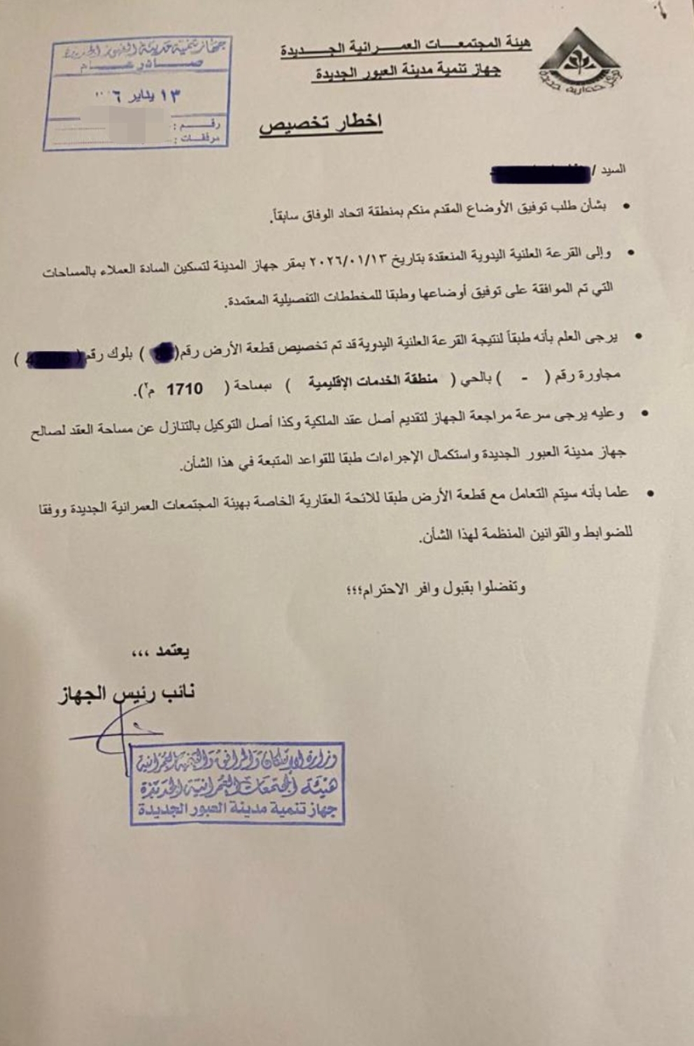 فرصة استثمارية قوية أرض مميزة للبيع في اتحاد الوفاق الموقع اتحاد الوفاق العبور الجديدة المساحة 1710 متر نسبة البناء 40 عدد الأدوار بدروم أرضي 3 أدوار متكررة لا توجد مهلة بناء مميزات استثنائية مطلة مباشرة على منطقة الخدمات شارع رئيسي بعرض 18 متر تصلح لمشروع سكني راق موقع واعد بزيادة سعرية قوية خلال الفترة القادمة سعر مميز مناسب لحجم وموقع القطعة فرصة حقيقية للمستثمرين الباحثين عن عائد قوي مرفق رسم لتقسيم الارض الي 3 عمارات