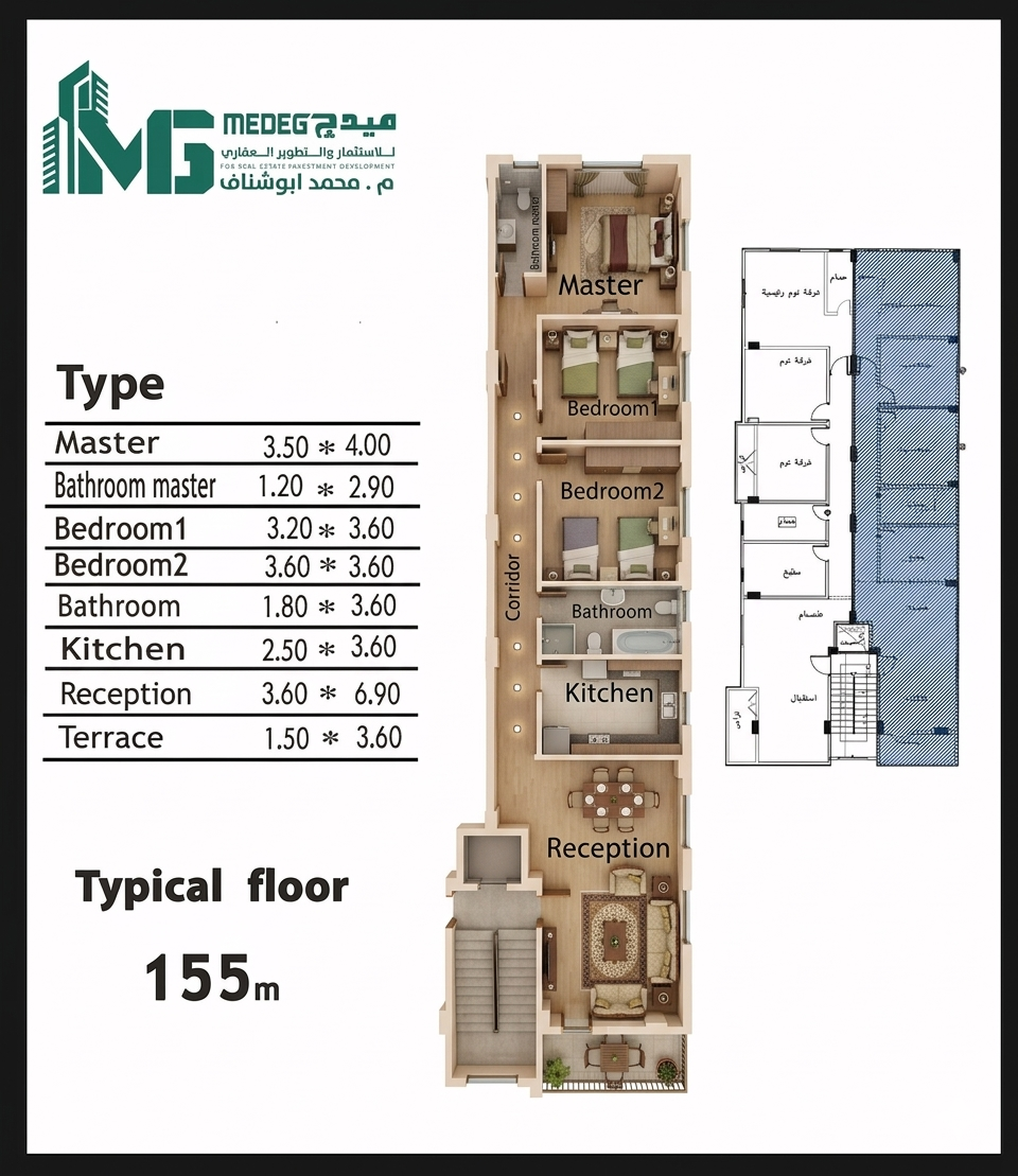 شقه مميزه 155 متر 3 غرفه منهم واحده ماستر 2 حمام مطبخ ريسبشن قطعتين